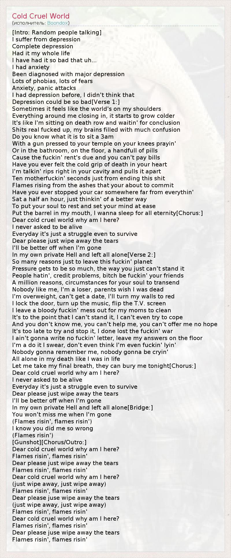А как ты думаешь, о чем песня "Cold Cruel World" ?