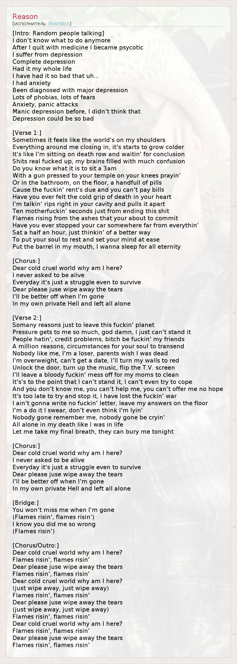 [Intro: Random people talking] I don't know what to do anymore After I quit with medicine I became psycotic I suffer from depression Complete depression Had it my whole life I have had it so bad that uh... I had anxiety Been diagnosed with major depression Lots of phobias, lots of fears Anxiety, panic attacks Manic depression before, I didn't think that Depression could be so bad [Verse 1:] Sometimes it feels like the world's on my shoulders Everything around me closing in, it's starts to grow colder It's like I'm sitting on death row and waitin' for conclusion Shits real fucked up, my brains filled with much confusion Do you know what it is to sit a 3am With a gun pressed to your temple on your knees prayin' Or in the bathroom, on the floor, a handfull of pills Cause the fuckin' rent's due and you can't pay bills Have you ever felt the cold grip of death in your heart I'm talkin' rips right in your cavity and pulls it apart Ten motherfuckin' seconds just from ending this shit Flames rising from the ashes that your about to commit Have you ever stopped your car somewhere far from everythin' Sat a half an hour, just thinkin' of a better way To put your soul to rest and set your mind at ease Put the barrel in my mouth, I wanna sleep for all eternity [Chorus:] Dear cold cruel world why am I here? I never asked to be alive Everyday it's just a struggle even to survive Dear please juse wipe away the tears I'll be better off when I'm gone In my own private Hell and left all alone [Verse 2:] Somany reasons just to leave this fuckin' planet Pressure gets to me so much, god damn, I just can't stand it People hatin', credit problems, bitch be fuckin' my friends A million reasons, circumstances for your soul to transend Nobody like me, I'm a loser, parents wish I was dead I'm overweight, can't get a date, I'll turn my walls to red Unlock the door, turn up the music, flip the T.V. screen I'll leave a bloody fuckin' mess off for my moms to clean It's's to the point that I can't stand it, I can't even try to cope And you don't know me, you can't help me, you can't offer me no hope It's too late to try and stop it, I have lost the fuckin' war I ain't gonna write no fuckin' letter, leave my answers on the floor I'm a do it I swear, don't even think I'm lyin' Nobody gone remember me, nobody gone be cryin' All alone in my death like I was in life Let me take my final breath, they can bury me tonight [Chorus:] Dear cold cruel world why am I here? I never asked to be alive Everyday it's just a struggle even to survive Dear please juse wipe away the tears I'll be better off when I'm gone In my own private Hell and left all alone [Bridge:] You won't miss me when I'm gone (Flames risin', flames risin') I know you did me so wrong (Flames risin') [Chorus/Outro:] Dear cold cruel world why am I here? Flames risin', flames risin' Dear please juse wipe away the tears Flames risin', flames risin' Dear cold cruel world why am I here? (just wipe away, just wipe away) Flames risin', flames risin' Dear please juse wipe away the tears (just wipe away, just wipe away) Flames risin', flames risin' Dear cold cruel world why am I here? Flames risin', flames risin' Dear please juse wipe away the tears Flames risin', flames risin'