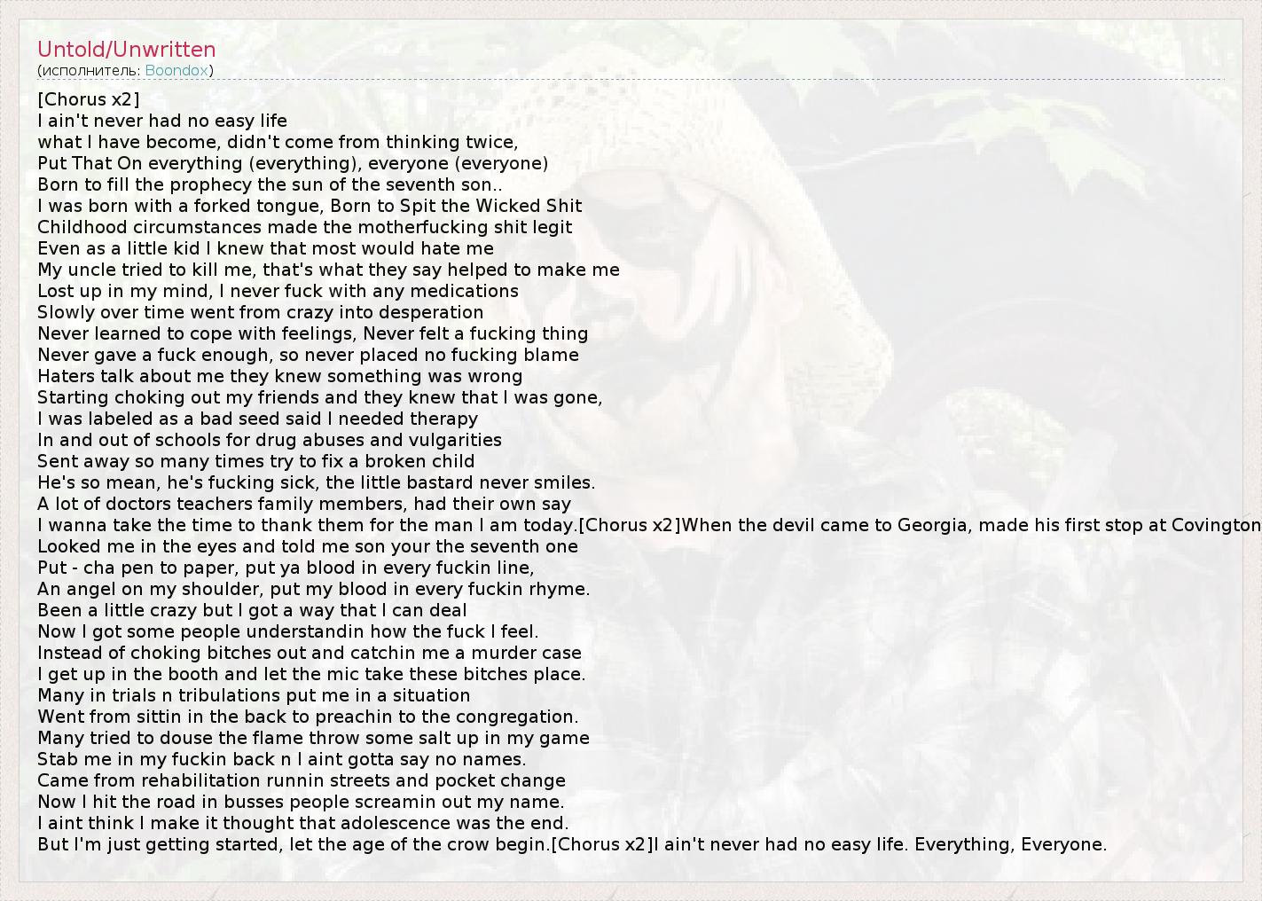 But I'm just getting started, let the age of the crow begin.[Chorus x2]I ain't never had no easy life. Everything, Everyone.
