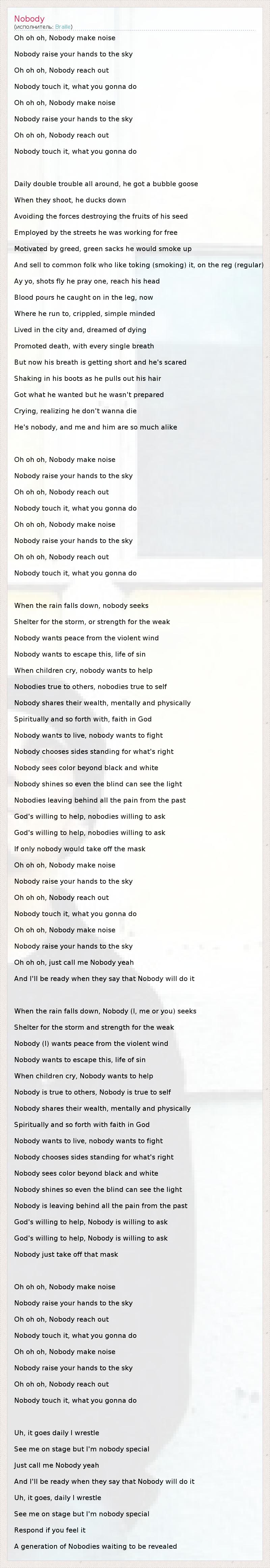 Это интересно:Существует несколько исполнителей по имени "Braille":1. Praveen Sharma - учасник электронных дуэтов Sepalcure, а также Praveen & Benoît. Кроме этого имеет пару EP в своём активе. 2. Малоизвестная хардкор группа 90-ых. 3, Bryan Winchester - MC из Портленда, штат Орегон.Брайль был близок к хип-хопу ещё с детства. Слыша разнообразие различных стилей и исполнителей,... продолжение
