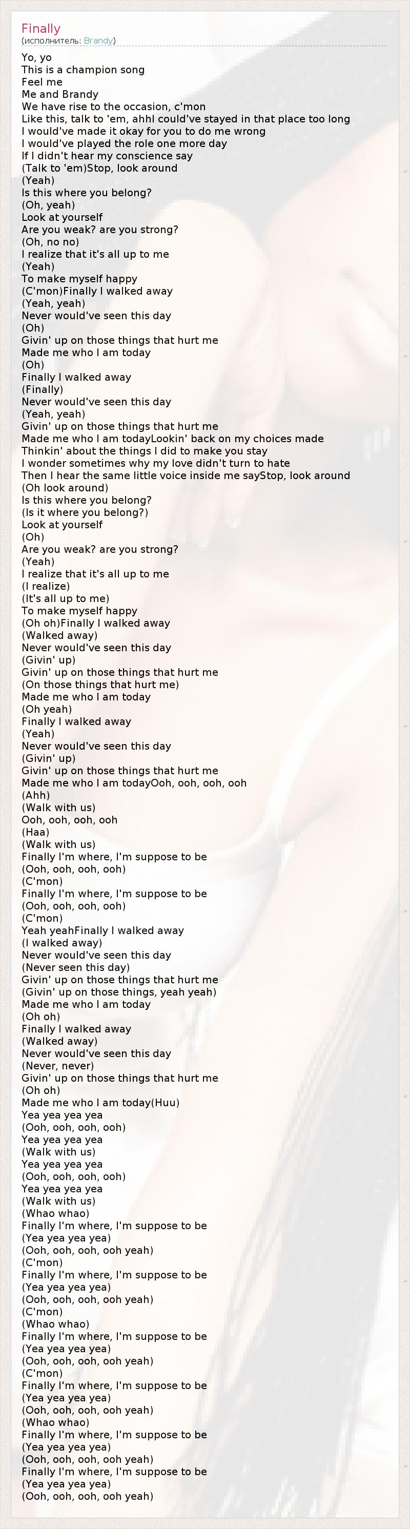Yo, yo This is a champion song Feel me Me and Brandy We have rise to the occasion, c'mon Like this, talk to 'em, ahhI could've stayed in that place too long I would've made it okay for you to do me wrong I would've played the role one more day If I didn't hear my conscience say (Talk to 'em)Stop, look around (Yeah) Is this where you belong? (Oh, yeah) Look at yourself Are you weak? are you strong? (Oh, no no) I realize that it's all up to me (Yeah) To make myself happy (C'mon)Finally I walked away (Yeah, yeah) Never would've seen this day (Oh) Givin' up on those things that hurt me Made me who I am today (Oh) Finally I walked away (Finally) Never would've seen this day (Yeah, yeah) Givin' up on those things that hurt me Made me who I am todayLookin' back on my choices made Thinkin' about the things I did to make you stay I wonder sometimes why my love didn't turn to hate Then I hear the same little voice inside me sayStop, look around (Oh look around) Is this where you belong? (Is it where you belong?) Look at yourself (Oh) Are you weak? are you strong? (Yeah) I realize that it's all up to me (I realize) (It's all up to me) To make myself happy (Oh oh)Finally I walked away (Walked away) Never would've seen this day (Givin' up) Givin' up on those things that hurt me (On those things that hurt me) Made me who I am today (Oh yeah) Finally I walked away (Yeah) Never would've seen this day (Givin' up) Givin' up on those things that hurt me Made me who I am todayOoh, ooh, ooh, ooh (Ahh) (Walk with us) Ooh, ooh, ooh, ooh (Haa) (Walk with us) Finally I'm where, I'm suppose to be (Ooh, ooh, ooh, ooh) (C'mon) Finally I'm where, I'm suppose to be (Ooh, ooh, ooh, ooh) (C'mon) Yeah yeahFinally I walked away (I walked away) Never would've seen this day (Never seen this day) Givin' up on those things that hurt me (Givin' up on those things, yeah yeah) Made me who I am today (Oh oh) Finally I walked away (Walked away) Never would've seen this day (Never, never) Givin' up on those things that hurt me (Oh oh) Made me who I am today(Huu) Yea yea yea yea (Ooh, ooh, ooh, ooh) Yea yea yea yea (Walk with us) Yea yea yea yea (Ooh, ooh, ooh, ooh) Yea yea yea yea (Walk with us) (Whao whao) Finally I'm where, I'm suppose to be (Yea yea yea yea) (Ooh, ooh, ooh, ooh yeah) (C'mon) Finally I'm where, I'm suppose to be (Yea yea yea yea) (Ooh, ooh, ooh, ooh yeah) (C'mon) (Whao whao) Finally I'm where, I'm suppose to be (Yea yea yea yea) (Ooh, ooh, ooh, ooh yeah) (C'mon) Finally I'm where, I'm suppose to be (Yea yea yea yea) (Ooh, ooh, ooh, ooh yeah) (Whao whao) Finally I'm where, I'm suppose to be (Yea yea yea yea) (Ooh, ooh, ooh, ooh yeah) Finally I'm where, I'm suppose to be (Yea yea yea yea) (Ooh, ooh, ooh, ooh yeah)