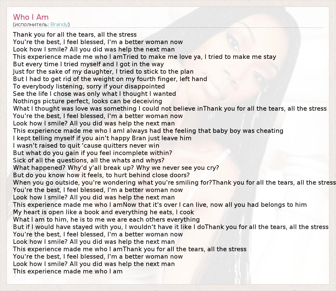 Thank you for all the tears, all the stress You're the best, I feel blessed, I'm a better woman now Look how I smile? All you did was help the next man This experience made me who I amTried to make me love ya, I tried to make me stay But every time I tried myself and I got in the way Just for the sake of my daughter, I tried to stick to the plan But I had to get rid of the weight on my fourth finger, left hand To everybody listening, sorry if your disappointed See the life I chose was only what I thought I wanted Nothings picture perfect, looks can be deceiving What I thought was love was something I could not believe inThank you for all the tears, all the stress You're the best, I feel blessed, I'm a better woman now Look how I smile? All you did was help the next man This experience made me who I amI always had the feeling that baby boy was cheating I kept telling myself if you ain't happy Bran just leave him I wasn't raised to quit 'cause quitters never win But what do you gain if you feel incomplete within? Sick of all the questions, all the whats and whys? What happened? Why'd y'all break up? Why we never see you cry? But do you know how it feels, to hurt behind close doors? When you go outside, you're wondering what you're smiling for?Thank you for all the tears, all the stress You're the best, I feel blessed, I'm a better woman now Look how I smile? All you did was help the next man This experience made me who I amNow that it's over I can live, now all you had belongs to him My heart is open like a book and everything he eats, I cook What I am to him, he is to me we are each others everything But if I would have stayed with you, I wouldn't have it like I doThank you for all the tears, all the stress You're the best, I feel blessed, I'm a better woman now Look how I smile? All you did was help the next man This experience made me who I amThank you for all the tears, all the stress You're the best, I feel blessed, I'm a better woman now Look how I smile? All you did was help the next man This experience made me who I am