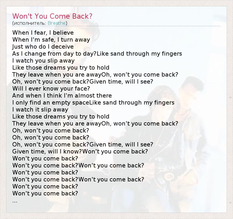 ГлавнаяИсполнителиBreatheWon't You Come Back?