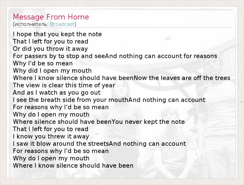 Это интересно:В Италии, где морские ветры гулким эхом отражаются от древних стен архитектурных памятников, и, унося за собой на дно морское крупицы камня, порождают в головах композиторов музыку космических глубин, именно там кроется тайна волшебства, творимого неземными аквалангистами - бирмингемской группой Broadcast. Когда-то целый квинтет, а затем дуэт, Broadcast очень любили творчество различных кино-композиторов,... продолжение