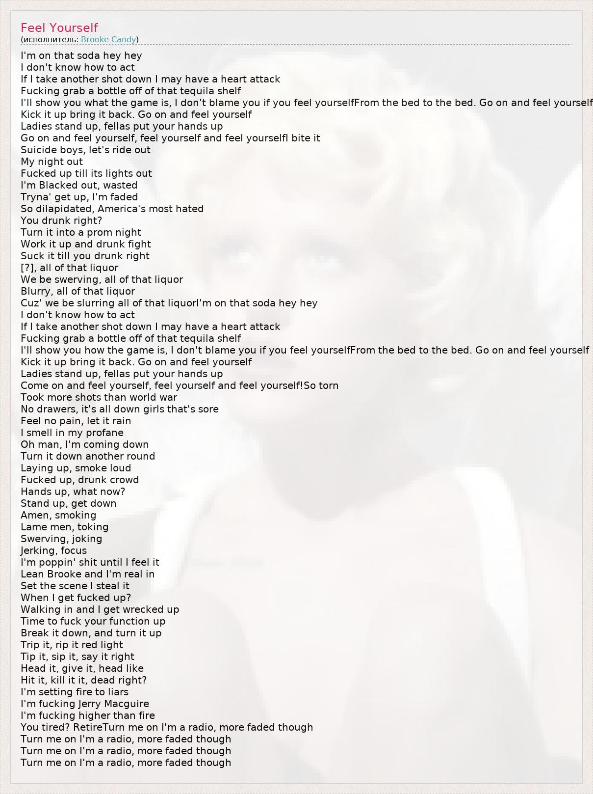 I'm on that soda hey hey I don't know how to act If I take another shot down I may have a heart attack Fucking grab a bottle off of that tequila shelf I'll show you what the game is, I don't blame you if you feel yourselfFrom the bed to the bed. Go on and feel yourself Kick it up bring it back. Go on and feel yourself Ladies stand up, fellas put your hands up Go on and feel yourself, feel yourself and feel yourselfI bite it Suicide boys, let's ride out My night out Fucked up till its lights out I'm Blacked out, wasted Tryna' get up, I'm faded So dilapidated, America's most hated You drunk right? Turn it into a prom night Work it up and drunk fight Suck it till you drunk right [?], all of that liquor We be swerving, all of that liquor Blurry, all of that liquor Cuz' we be slurring all of that liquorI'm on that soda hey hey I don't know how to act If I take another shot down I may have a heart attack Fucking grab a bottle off of that tequila shelf I'll show you how the game is, I don't blame you if you feel yourselfFrom the bed to the bed. Go on and feel yourself Kick it up bring it back. Go on and feel yourself Ladies stand up, fellas put your hands up Come on and feel yourself, feel yourself and feel yourself!So torn Took more shots than world war No drawers, it's all down girls that's sore Feel no pain, let it rain I smell in my profane Oh man, I'm coming down Turn it down another round Laying up, smoke loud Fucked up, drunk crowd Hands up, what now? Stand up, get down Amen, smoking Lame men, toking Swerving, joking Jerking, focus I'm poppin' shit until I feel it Lean Brooke and I'm real in Set the scene I steal it When I get fucked up? Walking in and I get wrecked up Time to fuck your function up Break it down, and turn it up Trip it, rip it red light Tip it, sip it, say it right Head it, give it, head like Hit it, kill it it, dead right? I'm setting fire to liars I'm fucking Jerry Macguire I'm fucking higher than fire You tired? RetireTurn me on I'm a radio, more faded though Turn me on I'm a radio, more faded though Turn me on I'm a radio, more faded though Turn me on I'm a radio, more faded though