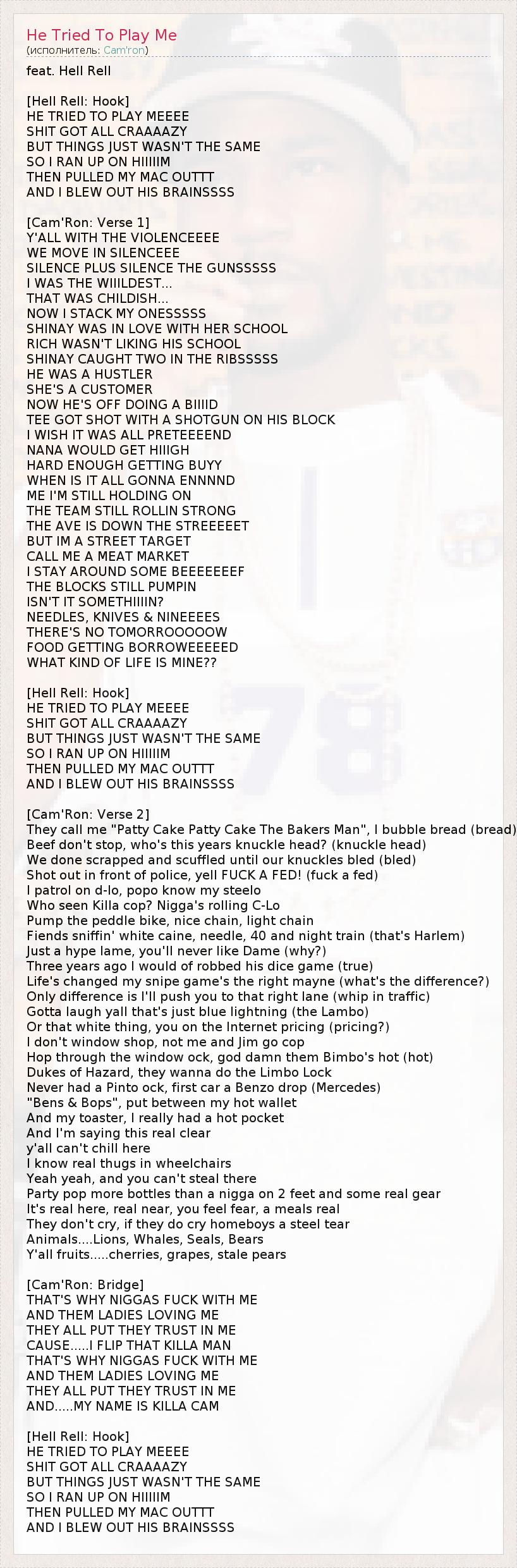 feat. Hell Rell [Hell Rell: Hook] HE TRIED TO PLAY MEEEE SHIT GOT ALL CRAAAAZY BUT THINGS JUST WASN'T THE SAME SO I RAN UP ON HIIIIIM THEN PULLED MY MAC OUTTT AND I BLEW OUT HIS BRAINSSSS [Cam'Ron: Verse 1] Y'ALL WITH THE VIOLENCEEEE WE MOVE IN SILENCEEE SILENCE PLUS SILENCE THE GUNSSSSS I WAS THE WIIILDEST... THAT WAS CHILDISH... NOW I STACK MY ONESSSSS SHINAY WAS IN LOVE WITH HER SCHOOL RICH WASN'T LIKING HIS SCHOOL SHINAY CAUGHT TWO IN THE RIBSSSSS HE WAS A HUSTLER SHE'S A CUSTOMER NOW HE'S OFF DOING A BIIIID TEE GOT SHOT WITH A SHOTGUN ON HIS BLOCK I WISH IT WAS ALL PRETEEEEND NANA WOULD GET HIIIGH HARD ENOUGH GETTING BUYY WHEN IS IT ALL GONNA ENNNND ME I'M STILL HOLDING ON THE TEAM STILL ROLLIN STRONG THE AVE IS DOWN THE STREEEEET BUT IM A STREET TARGET CALL ME A MEAT MARKET I STAY AROUND SOME BEEEEEEEF THE BLOCKS STILL PUMPIN ISN'T IT SOMETHIIIIN? NEEDLES, KNIVES & NINEEEES THERE'S NO TOMORROOOOOW FOOD GETTING BORROWEEEEED WHAT KIND OF LIFE IS MINE?? [Hell Rell: Hook] HE TRIED TO PLAY MEEEE SHIT GOT ALL CRAAAAZY BUT THINGS JUST WASN'T THE SAME SO I RAN UP ON HIIIIIM THEN PULLED MY MAC OUTTT AND I BLEW OUT HIS BRAINSSSS [Cam'Ron: Verse 2] They call me "Patty Cake Patty Cake The Bakers Man", I bubble bread (bread) Beef don't stop, who's this years knuckle head? (knuckle head) We done scrapped and scuffled until our knuckles bled (bled) Shot out in front of police, yell FUCK A FED! (fuck a fed) I patrol on d-lo, popo know my steelo Who seen Killa cop? Nigga's rolling C-Lo Pump the peddle bike, nice chain, light chain Fiends sniffin' white caine, needle, 40 and night train (that's Harlem) Just a hype lame, you'll never like Dame (why?) Three years ago I would of robbed his dice game (true) Life's changed my snipe game's the right mayne (what's the difference?) Only difference is I'll push you to that right lane (whip in traffic) Gotta laugh yall that's just blue lightning (the Lambo) Or that white thing, you on the Internet pricing (pricing?) I don't window shop, not me and Jim go cop Hop through the window ock, god damn them Bimbo's hot (hot) Dukes of Hazard, they wanna do the Limbo Lock Never had a Pinto ock, first car a Benzo drop (Mercedes) "Bens & Bops", put between my hot wallet And my toaster, I really had a hot pocket And I'm saying this real clear y'all can't chill here I know real thugs in wheelchairs Yeah yeah, and you can't steal there Party pop more bottles than a nigga on 2 feet and some real gear It's real here, real near, you feel fear, a meals real They don't cry, if they do cry homeboys a steel tear Animals....Lions, Whales, Seals, Bears Y'all fruits.....cherries, grapes, stale pears [Cam'Ron: Bridge] THAT'S WHY NIGGAS FUCK WITH ME AND THEM LADIES LOVING ME THEY ALL PUT THEY TRUST IN ME CAUSE.....I FLIP THAT KILLA MAN THAT'S WHY NIGGAS FUCK WITH ME AND THEM LADIES LOVING ME THEY ALL PUT THEY TRUST IN ME AND.....MY NAME IS KILLA CAM [Hell Rell: Hook] HE TRIED TO PLAY MEEEE SHIT GOT ALL CRAAAAZY BUT THINGS JUST WASN'T THE SAME SO I RAN UP ON HIIIIIM THEN PULLED MY MAC OUTTT AND I BLEW OUT HIS BRAINSSSS