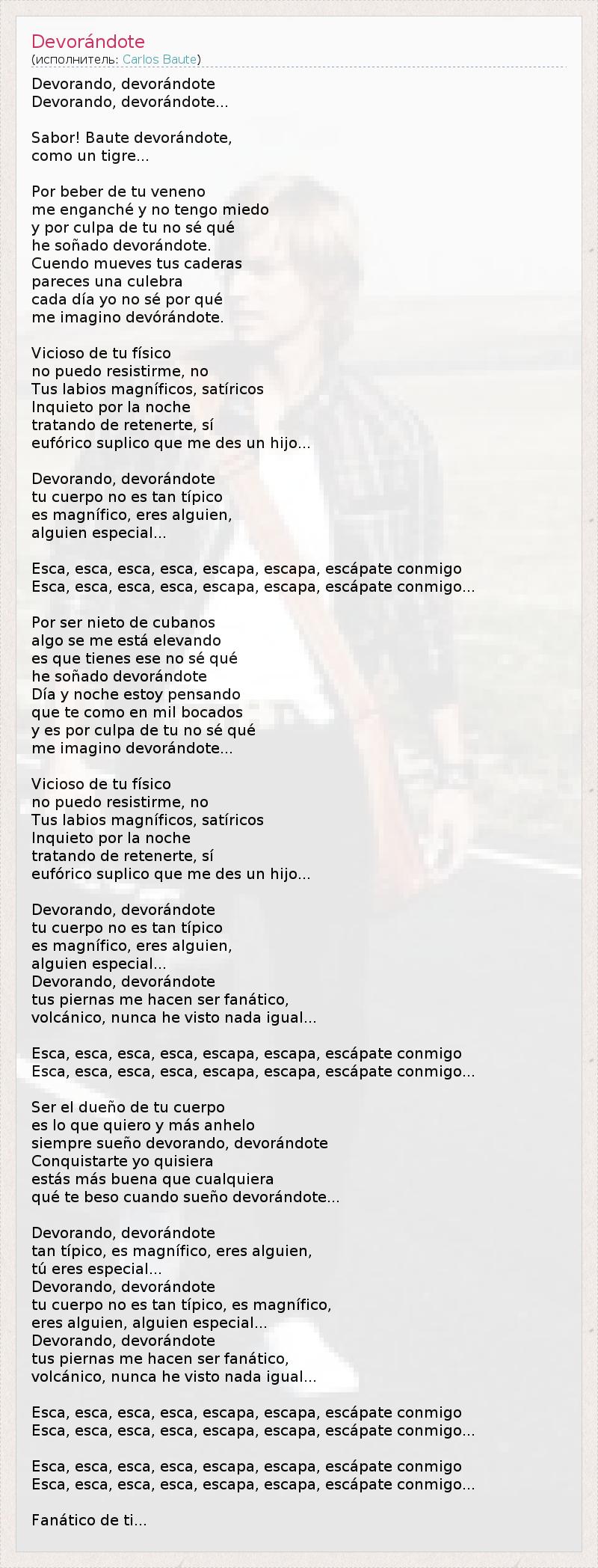 Это интересно:Карлос Бот (Carlos Baute, полное имя - Carlos Roberto Baute Jiménez) - венесуэльский певец, актер, танцор и телеведущий. Родился 8 марта 1974 года в столице Венесуэлы Каракасе. Его песни относятся к жанру латиноамериканской поп-музыки, однако, в репертуаре певца есть несколько баллад и песен в стиле «бачата». Работал в качестве модели и выпустил свой первый сольный альбом, названный "Orígenes I", еще в 1994 году.... продолжение
