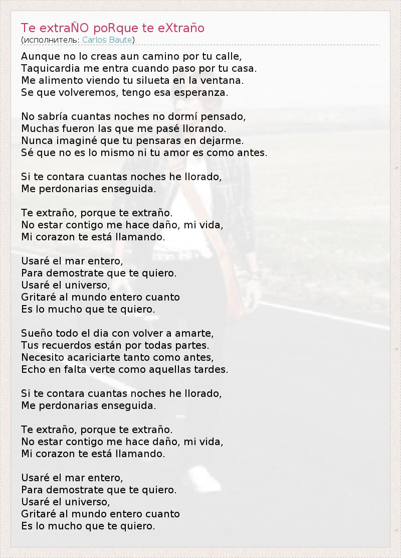Aunque no lo creas aun camino por tu calle, Taquicardia me entra cuando paso por tu casa. Me alimento viendo tu silueta en la ventana. Se que volveremos, tengo esa esperanza. No sabría cuantas noches no dormí pensado, Muchas fueron las que me pasé llorando. Nunca imaginé que tu pensaras en dejarme. Sé que no es lo mismo ni tu amor es como antes. Si te contara cuantas noches he llorado, Me perdonarias enseguida. Te extraño, porque te extraño. No estar contigo me hace daño, mi vida, Mi corazon te está llamando. Usaré el mar entero, Para demostrate que te quiero. Usaré el universo, Gritaré al mundo entero cuanto Es lo mucho que te quiero. Sueño todo el dia con volver a amarte, Tus recuerdos están por todas partes. Necesito acariciarte tanto como antes, Echo en falta verte como aquellas tardes. Si te contara cuantas noches he llorado, Me perdonarias enseguida. Te extraño, porque te extraño. No estar contigo me hace daño, mi vida, Mi corazon te está llamando. Usaré el mar entero, Para demostrate que te quiero. Usaré el universo, Gritaré al mundo entero cuanto Es lo mucho que te quiero.