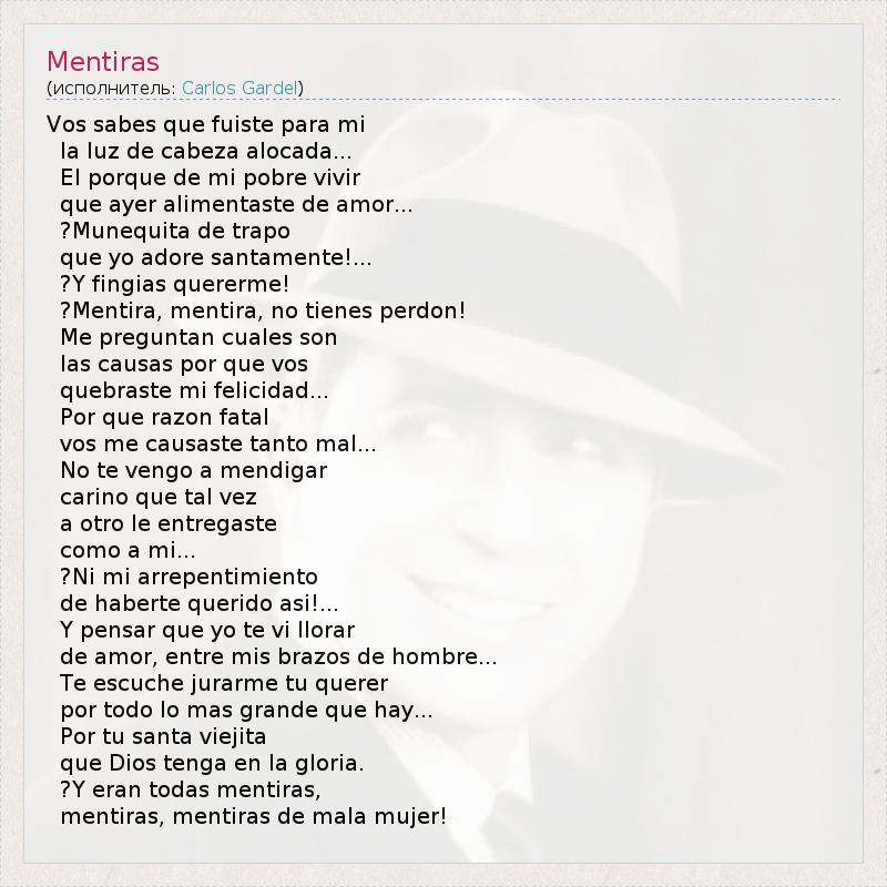 Vos sabes que fuiste para mi la luz de cabeza alocada... El porque de mi pobre vivir que ayer alimentaste de amor... ?Munequita de trapo que yo adore santamente!... ?Y fingias quererme! ?Mentira, mentira, no tienes perdon! Me preguntan cuales son las causas por que vos quebraste mi felicidad... Por que razon fatal vos me causaste tanto mal... No te vengo a mendigar carino que tal vez a otro le entregaste como a mi... ?Ni mi arrepentimiento de haberte querido asi!... Y pensar que yo te vi llorar de amor, entre mis brazos de hombre... Te escuche jurarme tu querer por todo lo mas grande que hay... Por tu santa viejita que Dios tenga en la gloria. ?Y eran todas mentiras, mentiras, mentiras de mala mujer!