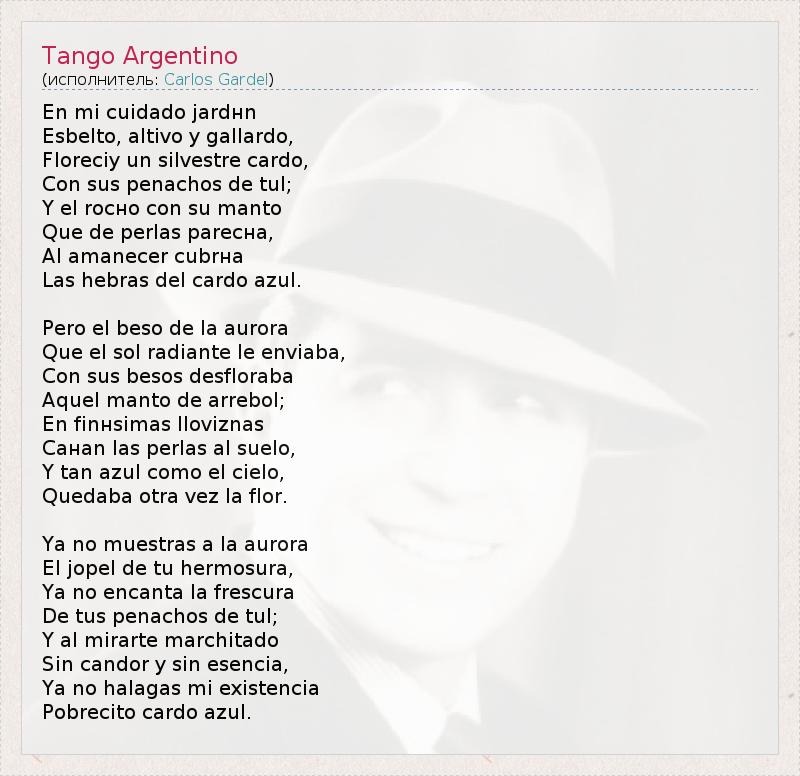 Это интересно:Карлос Гардель приехал в Буэнос-Айрес, когда ему было два года. В юности он становится известным в клубах и кафе в barrios (районах) Буэнос-Айреса благодаря своему исполнению известных народных песен дуэтом с Хосе Раззано. Но в 1920-е годы он постепенно переходит к исполнению только танго, подняв его своим пением до небывалых высот славы. Известный как Эль Зорцаль Криолло, птичка певчая из Буэнос-Айреса,... продолжение