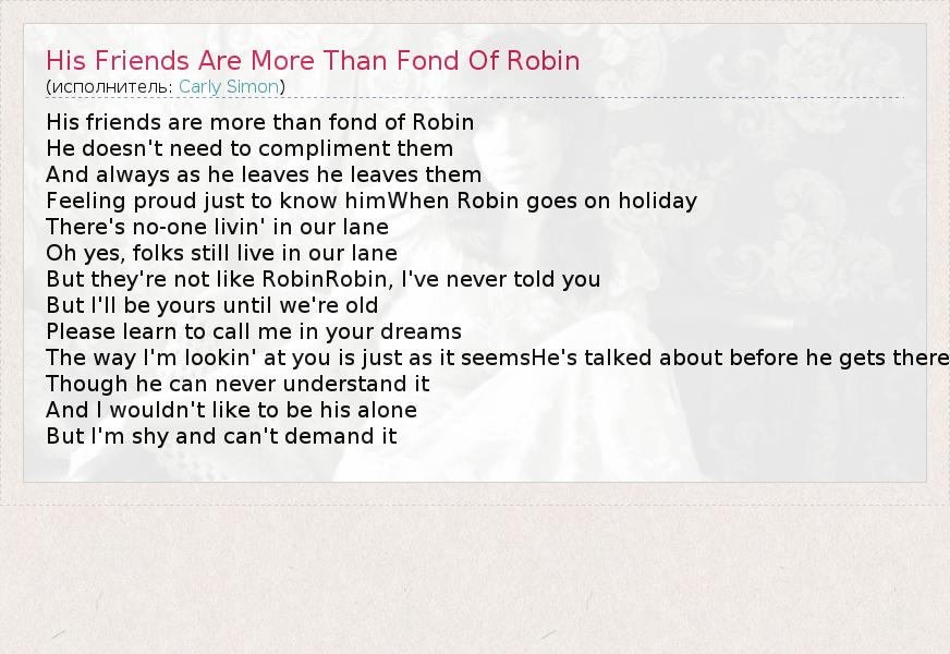 ГлавнаяИсполнителиCarly SimonHis Friends Are More Than Fond Of Robin
