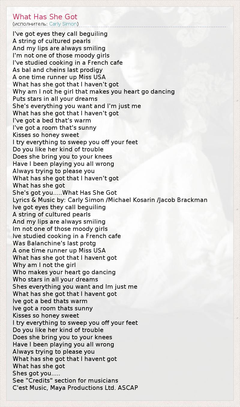 А как ты думаешь, о чем песня "What Has She Got" ?