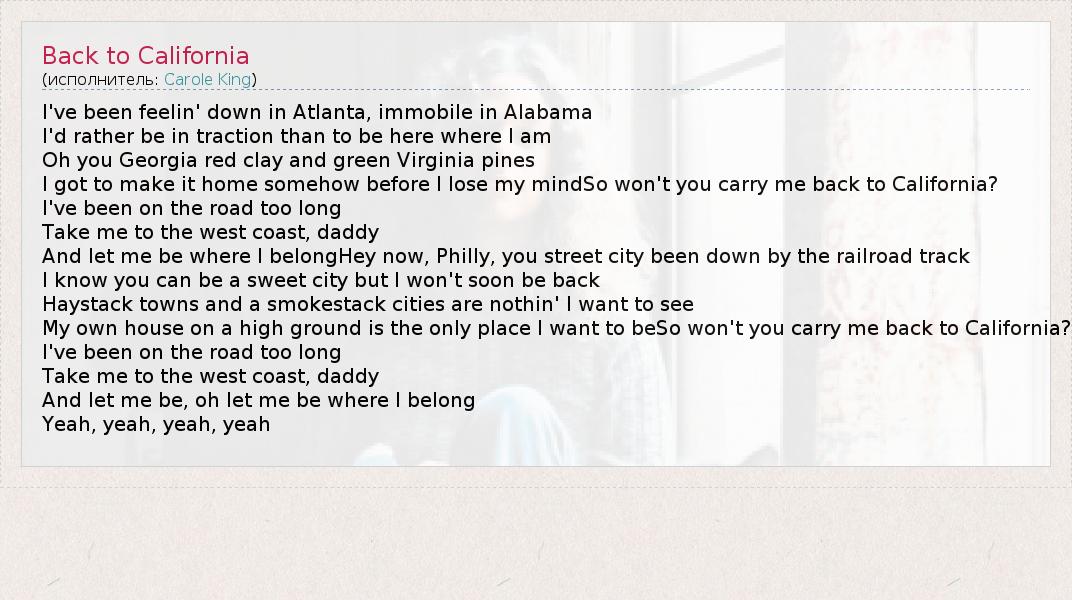 I got to make it home somehow before I lose my mindSo won't you carry me back to California?