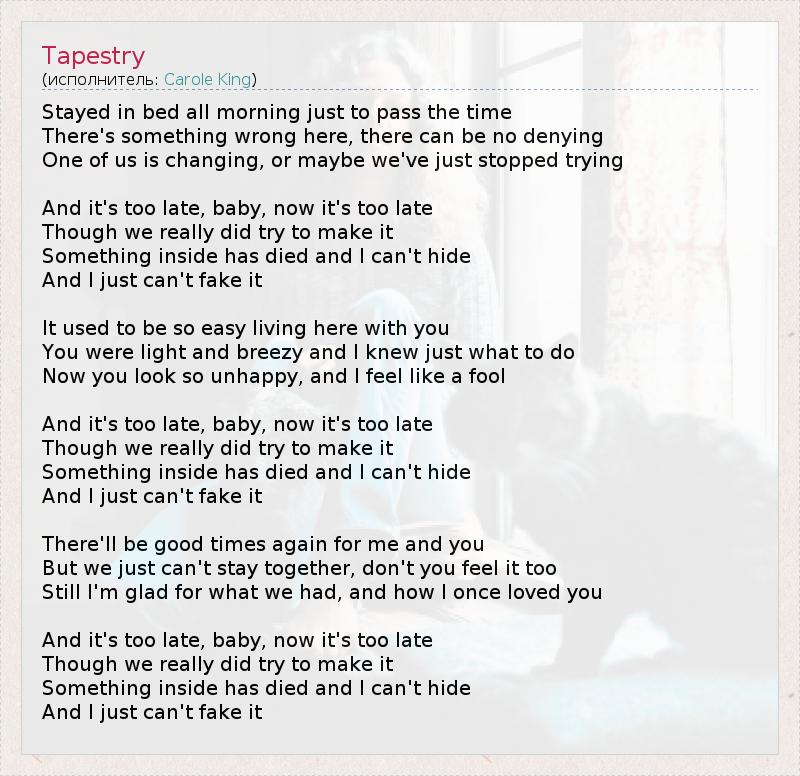 Я провалялась в кровати всё утро, просто чтобы убить время. Что-то здесь не так, невозможно отрицать. Один из нас становится другим, или мы просто прекратили попытки сохранить отношения. Уже слишком поздно, милый, теперь слишком поздно, Хотя мы честно пытались всё исправить. Что-то оборвалось внутри, и я не могу это скрывать, Я просто не могу притворяться. Когда-то было так легко жить здесь, с тобой. Ты был весел и беззаботен, и я точно знала, что делать. Теперь же ты выглядишь подавленным, и я чувствую себя по-дурацки. Уже слишком поздно, милый, теперь слишком поздно, Хотя мы честно пытались всё исправить. Что-то оборвалось внутри, и я не могу это скрывать, Я просто не могу притворяться. Хорошие времена снова настанут для тебя и меня, Но мы больше не можем быть вместе, ты ведь тоже это чувствуешь. И всё же я рада тому, что у нас было; я рада, что однажды любила тебя. Уже слишком поздно, милый, теперь слишком поздно, Хотя мы честно пытались всё исправить. Что-то оборвалось внутри, и я не могу это скрывать, Я просто не могу притворяться.