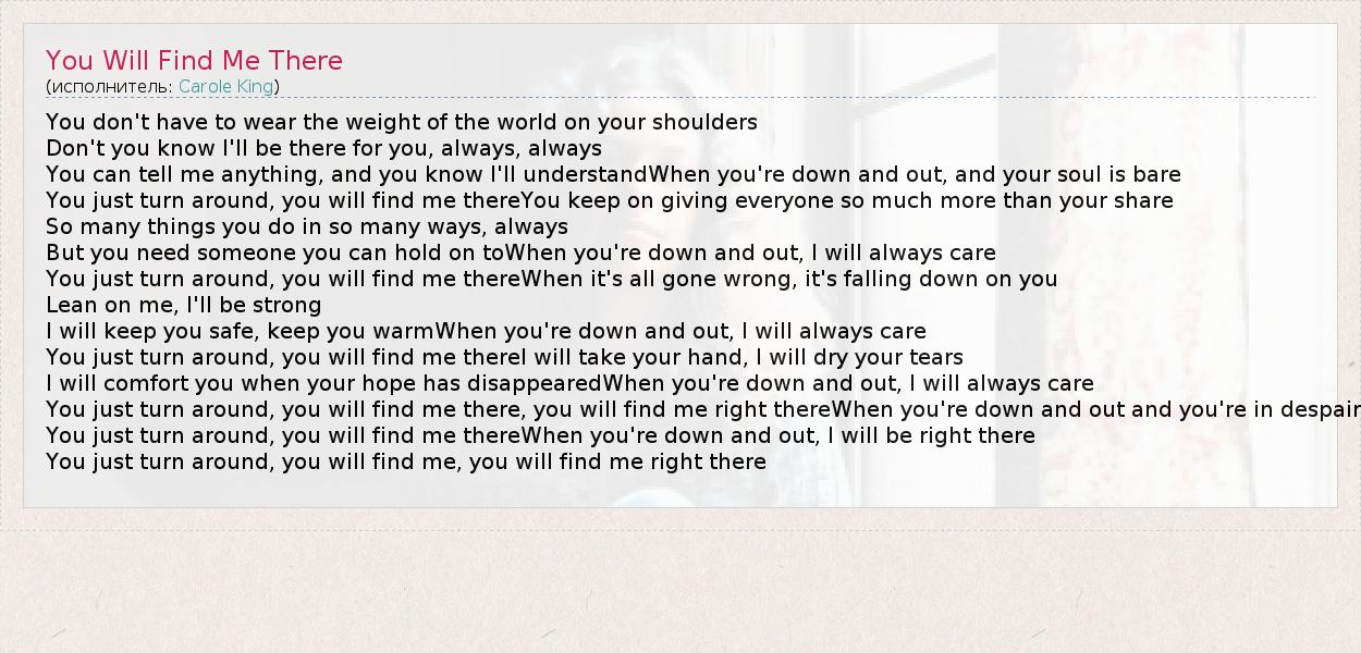 А как ты думаешь, о чем песня "You Will Find Me There" ?