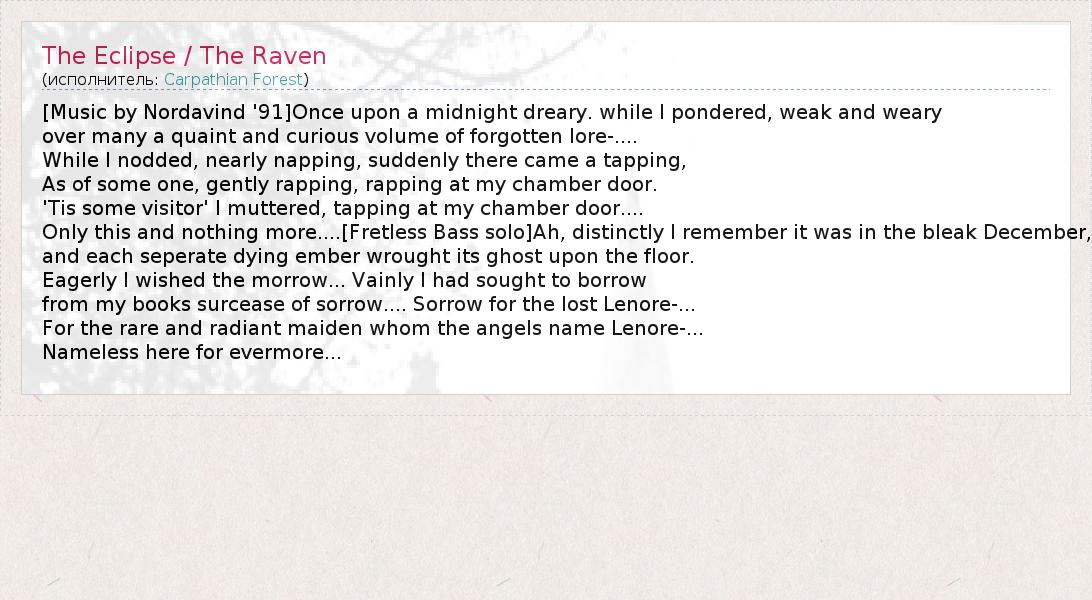[Music by Nordavind '91]Once upon a midnight dreary. while I pondered, weak and weary