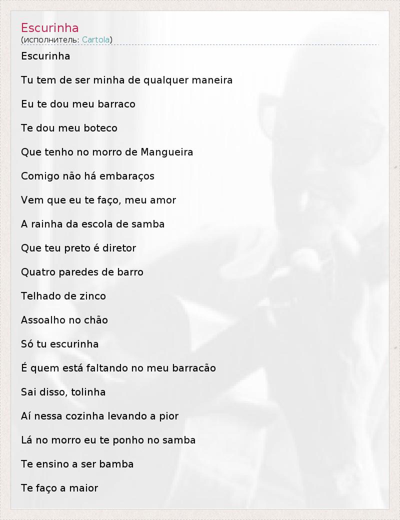 Это интересно:Есть две самбы. Одна - самба Картолы (Cartola) (1908-1980), и другая - все остальные. Это высокомерное утверждение, но я думаю, что это так и есть. Слушая много бразильской музыки, я продолжаю открывать супергигантов; Бразилия полна больших музыкантов. Но я все еще чувствую, что Картола является каким-то особенным. Для меня, Картола представляет самую красивую сущность бразильской музыки. Музыка... продолжение
