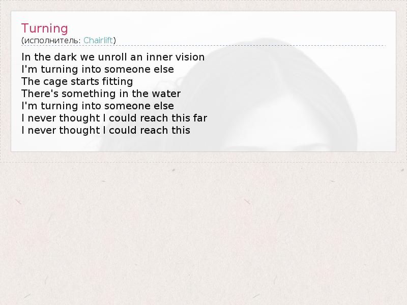In the dark we unroll an inner vision I'm turning into someone else The cage starts fitting There's something in the water I'm turning into someone else I never thought I could reach this far I never thought I could reach this