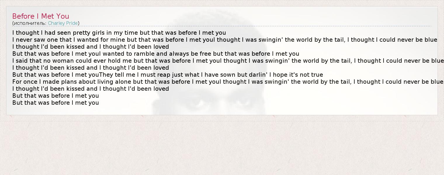 I thought I had seen pretty girls in my time but that was before I met you I never saw one that I wanted for mine but that was before I met youI thought I was swingin' the world by the tail, I thought I could never be blue I thought I'd been kissed and I thought I'd been loved But that was before I met youI wanted to ramble and always be free but that was before I met you I said that no woman could ever hold me but that was before I met youI thought I was swingin' the world by the tail, I thought I could never be blue I thought I'd been kissed and I thought I'd been loved But that was before I met youThey tell me I must reap just what I have sown but darlin' I hope it's not true For once I made plans about living alone but that was before I met youI thought I was swingin' the world by the tail, I thought I could never be blue I thought I'd been kissed and I thought I'd been loved But that was before I met you But that was before I met you
