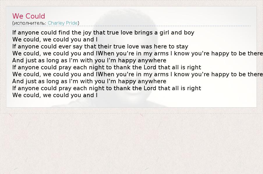 If anyone could find the joy that true love brings a girl and boy We could, we could you and I If anyone could ever say that their true love was here to stay We could, we could you and IWhen you're in my arms I know you're happy to be there And just as long as I'm with you I'm happy anywhere If anyone could pray each night to thank the Lord that all is right We could, we could you and IWhen you're in my arms I know you're happy to be there And just as long as I'm with you I'm happy anywhere If anyone could pray each night to thank the Lord that all is right We could, we could you and I