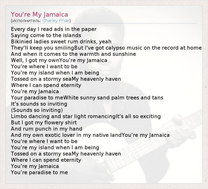 Every day I read ads in the paper Saying come to the islands Bikinied ladies sweet rum drinks, yeah They'll keep you smilingBut I've got calypso music on the record at home And when it comes to the warmth and sunshine Well, I got my ownYou're my Jamaica You're where I want to be You're my island when I am being Tossed on a stormy seaMy heavenly haven Where I can spend eternity You're my Jamaica Your paradise to meWhite sunny sand palm trees and tans It's sounds so inviting (Sounds so inviting) Limbo dancing and star light romancingIt's all so exciting But I got my flowery shirt And rum punch in my hand And my own exotic lover in my native landYou're my Jamaica You're where I want to be You're my island when I am being Tossed on a stormy seaMy heavenly haven Where I can spend eternity You're my Jamaica You're paradise to me