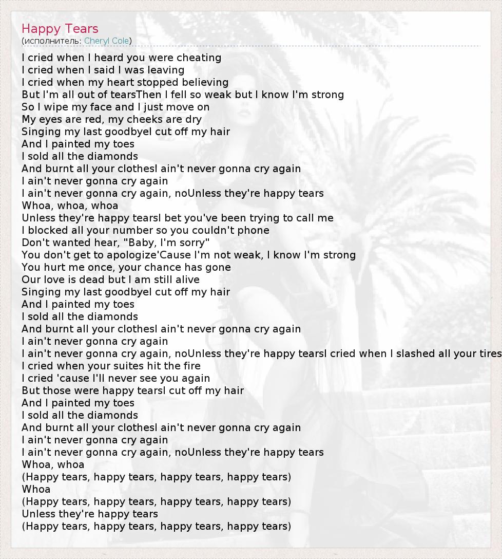 I ain't never gonna cry again, noUnless they're happy tearsI cried when I slashed all your tires