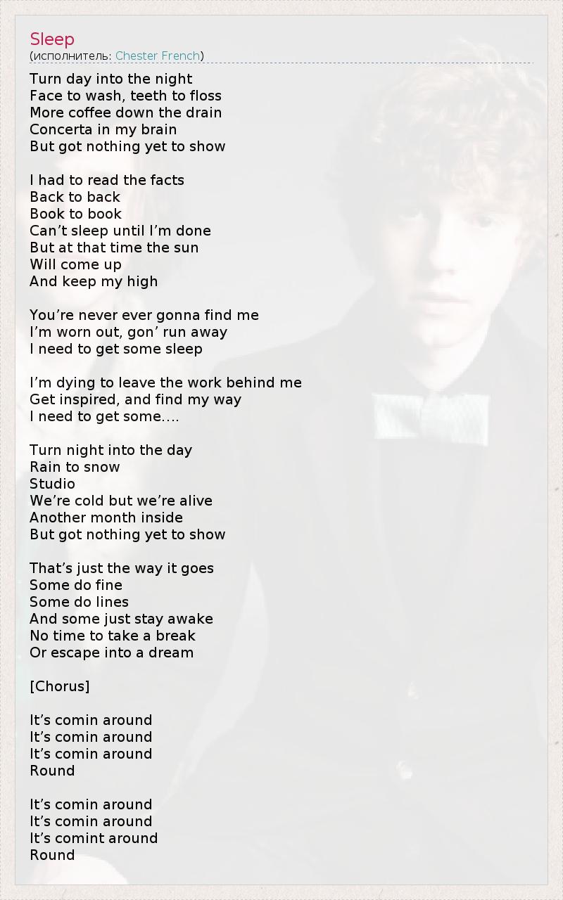 Turn day into the night Face to wash, teeth to floss More coffee down the drain Concerta in my brain But got nothing yet to show I had to read the facts Back to back Book to book Can’t sleep until I’m done But at that time the sun Will come up And keep my high You’re never ever gonna find me I’m worn out, gon’ run away I need to get some sleep I’m dying to leave the work behind me Get inspired, and find my way I need to get some…. Turn night into the day Rain to snow Studio We’re cold but we’re alive Another month inside But got nothing yet to show That’s just the way it goes Some do fine Some do lines And some just stay awake No time to take a break Or escape into a dream [Chorus] It’s comin around It’s comin around It’s comin around Round It’s comin around It’s comin around It’s comint around Round