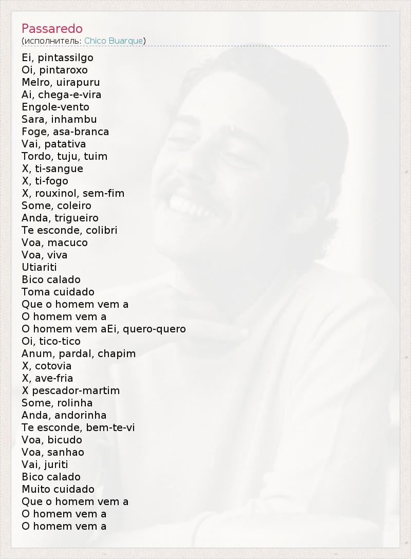 Это интересно:В 1999 году журнал "IstoE" провел опрос: кого бразильцы считают самым выдающимся бразильским музыкантом ХХ века. И хотя выбор был среди таких грандиозных имен, как А.К. Жобим, Милтон Нашименту, Жоао Жилберту, Ноел Роза, Пишингинья, Каэтану Велозу и Жилберту Жил, подсчет голосов показал: первый - Шику Буарке. Российским зрителям он знаком мало. Голос его можно услышать в заставке нового... продолжение