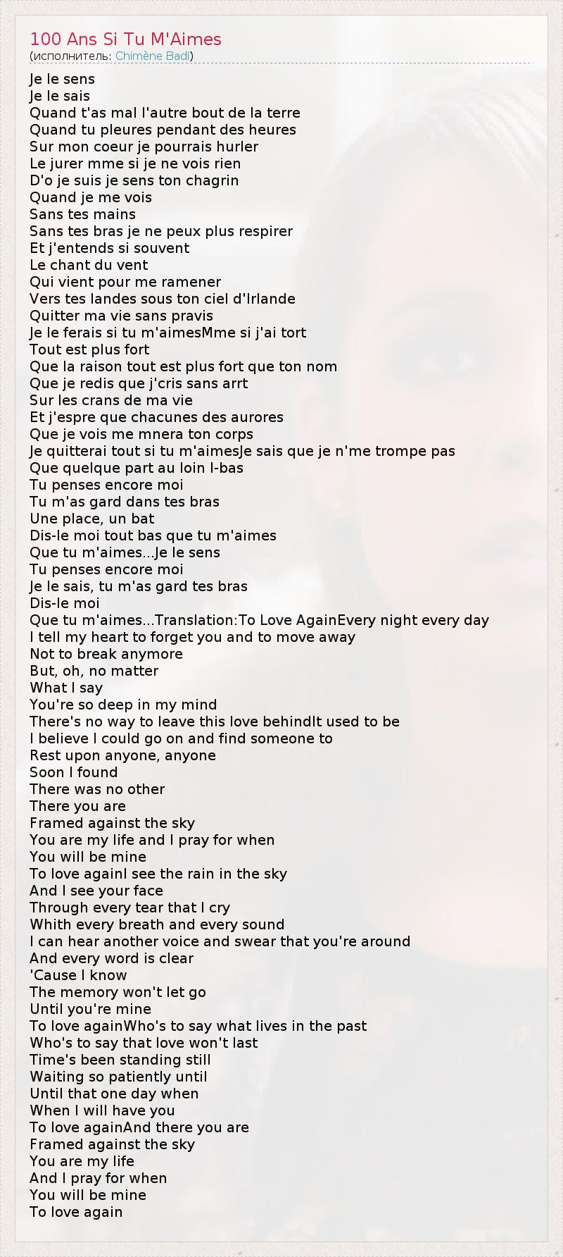 А как ты думаешь, о чем песня "100 Ans Si Tu M'Aimes" ?