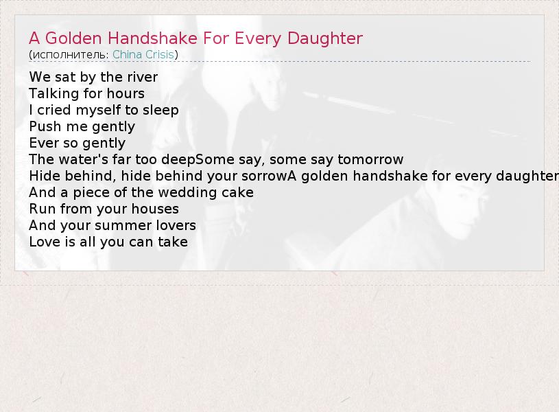 А как ты думаешь, о чем песня "A Golden Handshake For Every Daughter" ?