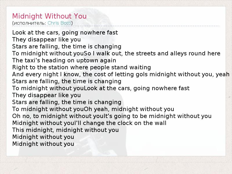 Look at the cars, going nowhere fast They disappear like you Stars are falling, the time is changing To midnight without youSo I walk out, the streets and alleys round here The taxi's heading on uptown again Right to the station where people stand waiting And every night I know, the cost of letting goIs midnight without you, yeah Stars are falling, the time is changing To midnight without youLook at the cars, going nowhere fast They disappear like you Stars are falling, the time is changing To midnight without youOh yeah, midnight without you Oh no, to midnight without youIt's going to be midnight without you Midnight without youI'll change the clock on the wall This midnight, midnight without you Midnight without you Midnight without you