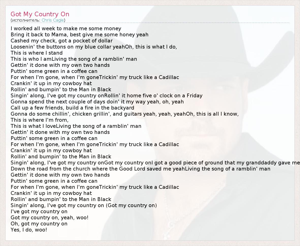 I worked all week to make me some money Bring it back to Mama, best give me some honey yeah Cashed my check, got a pocket of dollar Loosenin' the buttons on my blue collar yeahOh, this is what I do, This is where I stand This is who I amLiving the song of a ramblin' man Gettin' it done with my own two hands Puttin' some green in a coffee can For when I'm gone, when I'm goneTrickin' my truck like a Cadillac Crankin' it up in my cowboy hat Rollin' and bumpin' to the Man in Black Singin' along, I've got my country onRollin' it home five o' clock on a Friday Gonna spend the next couple of days doin' it my way yeah, oh, yeah Call up a few friends, build a fire in the backyard Gonna do some chillin', chicken grillin', and guitars yeah, yeah, yeahOh, this is all I know, This is where I'm from, This is what I loveLiving the song of a ramblin' man Gettin' it done with my own two hands Puttin' some green in a coffee can For when I'm gone, when I'm goneTrickin' my truck like a Cadillac Crankin' it up in my cowboy hat Rollin' and bumpin' to the Man in Black Singin' along, I've got my country onGot my country onI got a good piece of ground that my granddaddy gave me Down the road from the church where the Good Lord saved me yeahLiving the song of a ramblin' man Gettin' it done with my own two hands Puttin' some green in a coffee can For when I'm gone, when I'm goneTrickin' my truck like a Cadillac Crankin' it up in my cowboy hat Rollin' and bumpin' to the Man in Black Singin' along, I've got my country on (Got my country on) I've got my country on Got my country on, yeah, woo! Oh, got my country on Yes, I do, woo!