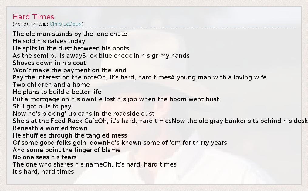 She's at the Feed-Rack CafeOh, it's hard, hard timesNow the ole gray banker sits behind his desk