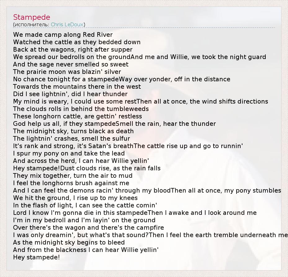 We made camp along Red River Watched the cattle as they bedded down Back at the wagons, right after supper We spread our bedrolls on the groundAnd me and Willie, we took the night guard And the sage never smelled so sweet The prairie moon was blazin' silver No chance tonight for a stampedeWay over yonder, off in the distance Towards the mountains there in the west Did I see lightnin', did I hear thunder My mind is weary, I could use some restThen all at once, the wind shifts directions The clouds rolls in behind the tumbleweeds These longhorn cattle, are gettin' restless God help us all, if they stampedeSmell the rain, hear the thunder The midnight sky, turns black as death The lightnin' crashes, smell the sulfur It's rank and strong, it's Satan's breathThe cattle rise up and go to runnin' I spur my pony on and take the lead And across the herd, I can hear Willie yellin' Hey stampede!Dust clouds rise, as the rain falls They mix together, turn the air to mud I feel the longhorns brush against me And I can feel the demons racin' through my bloodThen all at once, my pony stumbles We hit the ground, I rise up to my knees In the flash of light, I can see the cattle comin' Lord I know I'm gonna die in this stampedeThen I awake and I look around me I'm in my bedroll and I'm layin' on the ground Over there's the wagon and there's the campfire I was only dreamin', but what's that sound?Then I feel the earth tremble underneath me As the midnight sky begins to bleed And from the blackness I can hear Willie yellin' Hey stampede!