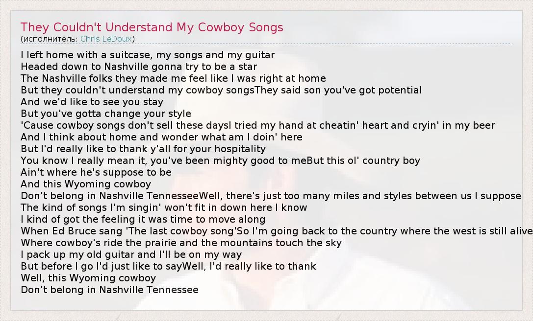 А как ты думаешь, о чем песня "They Couldn't Understand My Cowboy Songs" ?