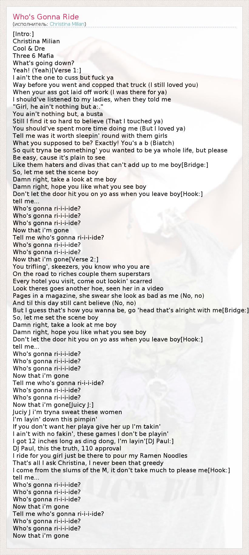 А как ты думаешь, о чем песня "Who's Gonna Ride" ?