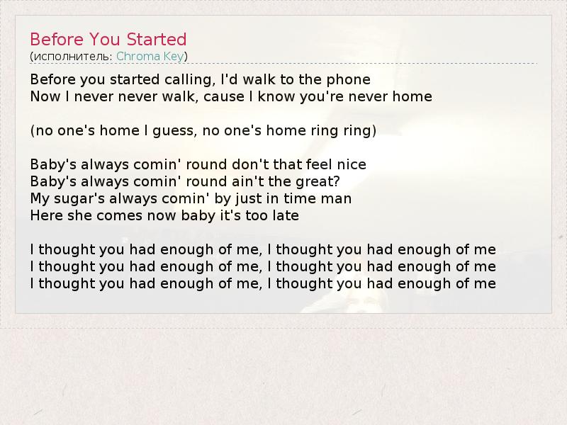 Брат за брата(ost ПРИТЯЖЕНИЕ)  Я ГАТОВИЛА ЛИБИДУ ПОЛНАЯ ВЕРСИЯ (ЕСТЬ ТЕКСТ)  Cocaine (есть перевод текста)❤  La Gelosia (с текстом перевода)  Продолжение медитации на энергии  Доставляет!(текст)  Голуби. ...Там, там, высоко...  Виноград (Минус)  Weekend!(текст)  Порушка-Параня