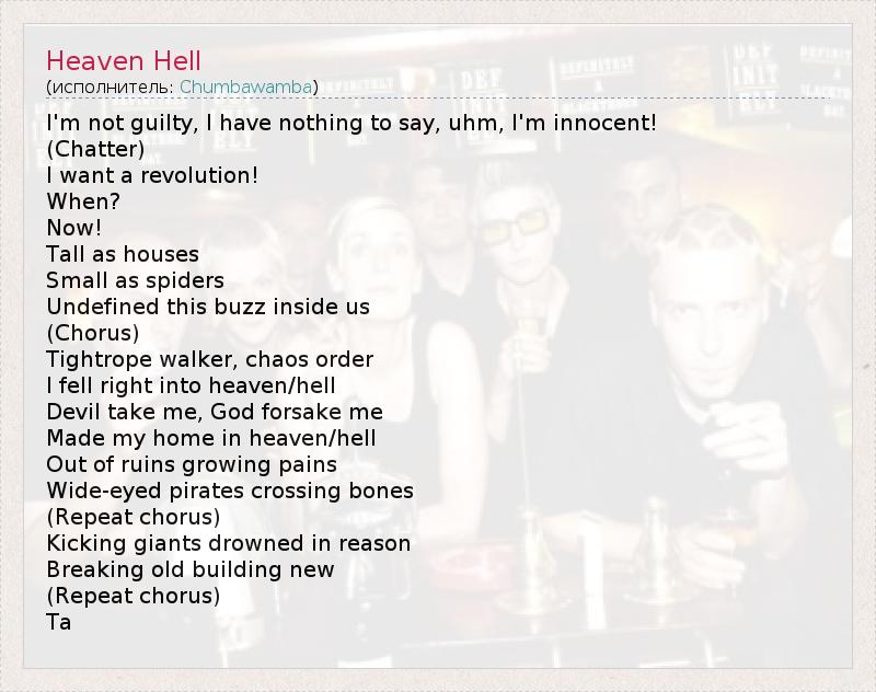 I'm not guilty, I have nothing to say, uhm, I'm innocent! (Chatter) I want a revolution! When? Now! Tall as houses Small as spiders Undefined this buzz inside us (Chorus) Tightrope walker, chaos order I fell right into heaven/hell Devil take me, God forsake me Made my home in heaven/hell Out of ruins growing pains Wide-eyed pirates crossing bones (Repeat chorus) Kicking giants drowned in reason Breaking old building new (Repeat chorus) Ta