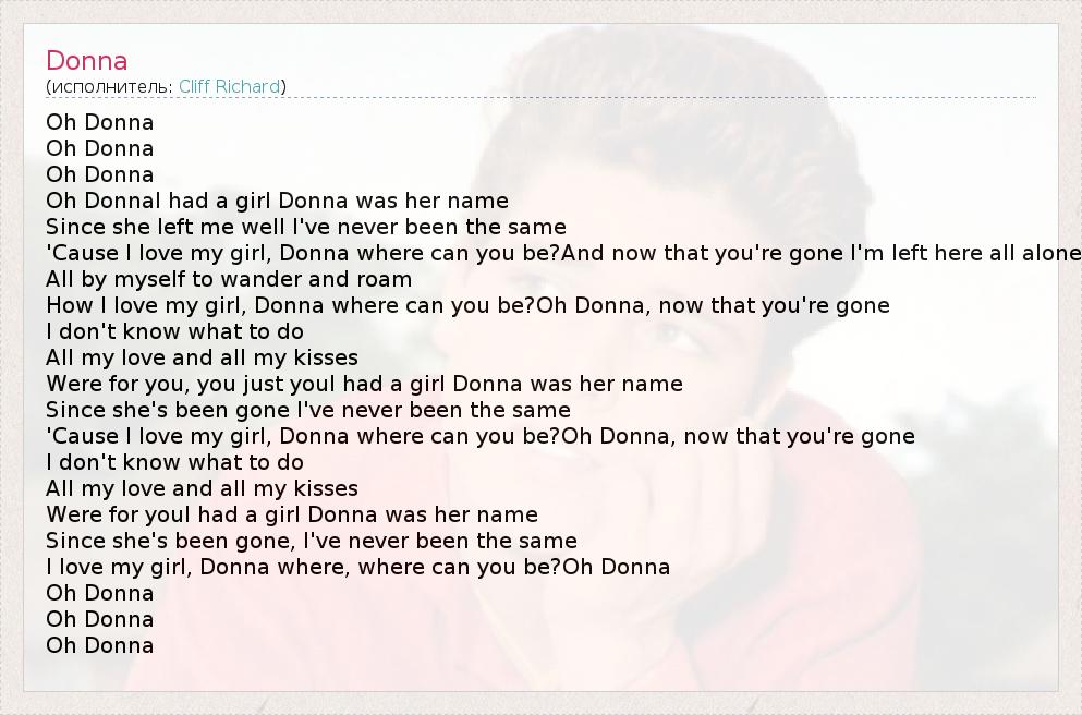 Oh Donna Oh Donna Oh Donna Oh DonnaI had a girl Donna was her name Since she left me well I've never been the same 'Cause I love my girl, Donna where can you be?And now that you're gone I'm left here all alone All by myself to wander and roam How I love my girl, Donna where can you be?Oh Donna, now that you're gone I don't know what to do All my love and all my kisses Were for you, you just youI had a girl Donna was her name Since she's been gone I've never been the same 'Cause I love my girl, Donna where can you be?Oh Donna, now that you're gone I don't know what to do All my love and all my kisses Were for youI had a girl Donna was her name Since she's been gone, I've never been the same I love my girl, Donna where, where can you be?Oh Donna Oh Donna Oh Donna Oh Donna