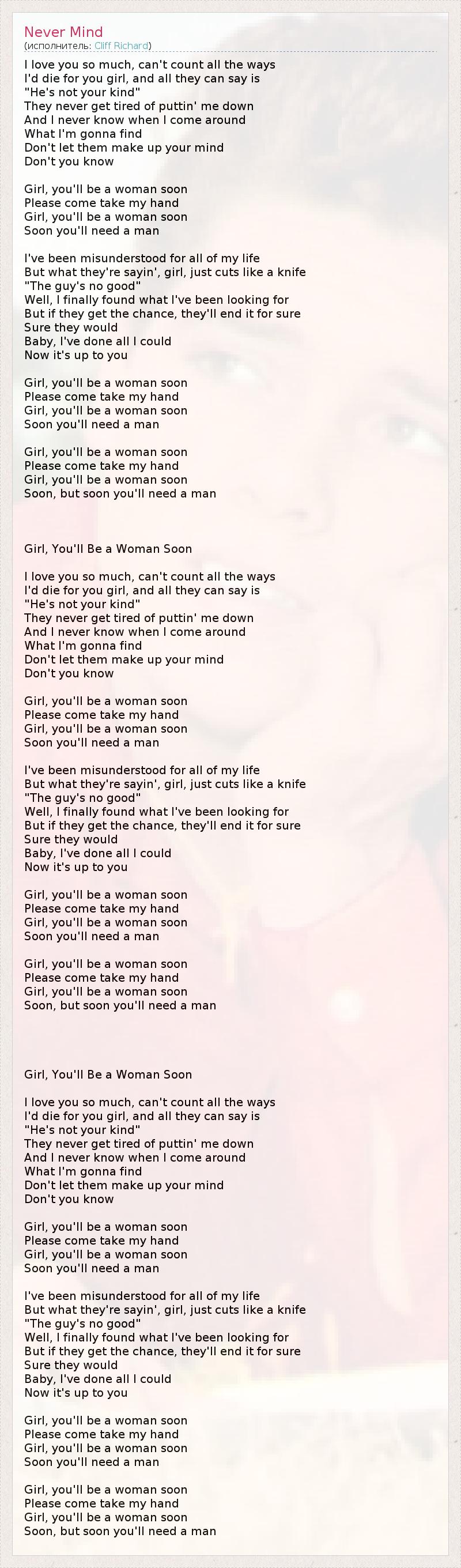 I love you so much, can't count all the ways I'd die for you girl, and all they can say is "He's not your kind" They never get tired of puttin' me down And I never know when I come around What I'm gonna find Don't let them make up your mind Don't you know Girl, you'll be a woman soon Please come take my hand Girl, you'll be a woman soon Soon you'll need a man I've been misunderstood for all of my life But what they're sayin', girl, just cuts like a knife "The guy's no good" Well, I finally found what I've been looking for But if they get the chance, they'll end it for sure Sure they would Baby, I've done all I could Now it's up to you Girl, you'll be a woman soon Please come take my hand Girl, you'll be a woman soon Soon you'll need a man Girl, you'll be a woman soon Please come take my hand Girl, you'll be a woman soon Soon, but soon you'll need a man Girl, You'll Be a Woman Soon I love you so much, can't count all the ways I'd die for you girl, and all they can say is "He's not your kind" They never get tired of puttin' me down And I never know when I come around What I'm gonna find Don't let them make up your mind Don't you know Girl, you'll be a woman soon Please come take my hand Girl, you'll be a woman soon Soon you'll need a man I've been misunderstood for all of my life But what they're sayin', girl, just cuts like a knife "The guy's no good" Well, I finally found what I've been looking for But if they get the chance, they'll end it for sure Sure they would Baby, I've done all I could Now it's up to you Girl, you'll be a woman soon Please come take my hand Girl, you'll be a woman soon Soon you'll need a man Girl, you'll be a woman soon Please come take my hand Girl, you'll be a woman soon Soon, but soon you'll need a man Girl, You'll Be a Woman Soon I love you so much, can't count all the ways I'd die for you girl, and all they can say is "He's not your kind" They never get tired of puttin' me down And I never know when I come around What I'm gonna find Don't let them make up your mind Don't you know Girl, you'll be a woman soon Please come take my hand Girl, you'll be a woman soon Soon you'll need a man I've been misunderstood for all of my life But what they're sayin', girl, just cuts like a knife "The guy's no good" Well, I finally found what I've been looking for But if they get the chance, they'll end it for sure Sure they would Baby, I've done all I could Now it's up to you Girl, you'll be a woman soon Please come take my hand Girl, you'll be a woman soon Soon you'll need a man Girl, you'll be a woman soon Please come take my hand Girl, you'll be a woman soon Soon, but soon you'll need a man