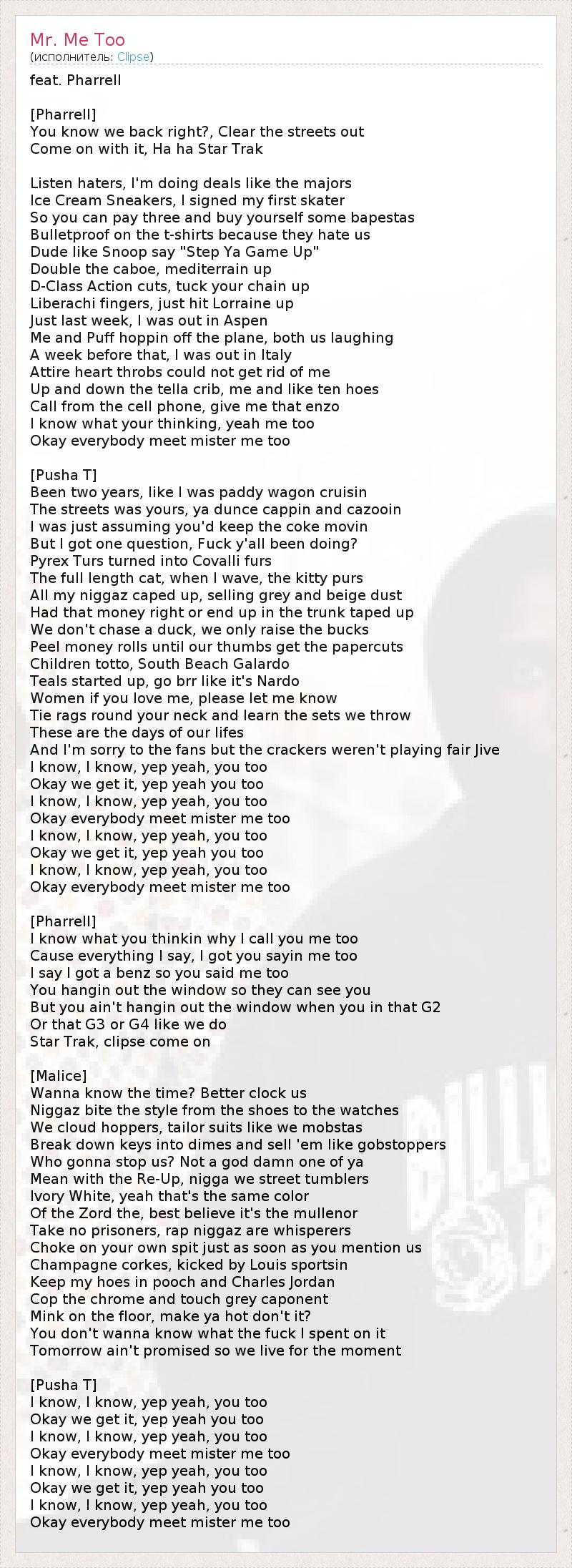 feat. Pharrell [Pharrell] You know we back right?, Clear the streets out Come on with it, Ha ha Star Trak Listen haters, I'm doing deals like the majors Ice Cream Sneakers, I signed my first skater So you can pay three and buy yourself some bapestas Bulletproof on the t-shirts because they hate us Dude like Snoop say "Step Ya Game Up" Double the caboe, mediterrain up D-Class Action cuts, tuck your chain up Liberachi fingers, just hit Lorraine up Just last week, I was out in Aspen Me and Puff hoppin off the plane, both us laughing A week before that, I was out in Italy Attire heart throbs could not get rid of me Up and down the tella crib, me and like ten hoes Call from the cell phone, give me that enzo I know what your thinking, yeah me too Okay everybody meet mister me too [Pusha T] Been two years, like I was paddy wagon cruisin The streets was yours, ya dunce cappin and cazooin I was just assuming you'd keep the coke movin But I got one question, Fuck y'all been doing? Pyrex Turs turned into Covalli furs The full length cat, when I wave, the kitty purs All my niggaz caped up, selling grey and beige dust Had that money right or end up in the trunk taped up We don't chase a duck, we only raise the bucks Peel money rolls until our thumbs get the papercuts Children totto, South Beach Galardo Teals started up, go brr like it's Nardo Women if you love me, please let me know Tie rags round your neck and learn the sets we throw These are the days of our lifes And I'm sorry to the fans but the crackers weren't playing fair Jive I know, I know, yep yeah, you too Okay we get it, yep yeah you too I know, I know, yep yeah, you too Okay everybody meet mister me too I know, I know, yep yeah, you too Okay we get it, yep yeah you too I know, I know, yep yeah, you too Okay everybody meet mister me too [Pharrell] I know what you thinkin why I call you me too Cause everything I say, I got you sayin me too I say I got a benz so you said me too You hangin out the window so they can see you But you ain't hangin out the window when you in that G2 Or that G3 or G4 like we do Star Trak, clipse come on [Malice] Wanna know the time? Better clock us Niggaz bite the style from the shoes to the watches We cloud hoppers, tailor suits like we mobstas Break down keys into dimes and sell 'em like gobstoppers Who gonna stop us? Not a god damn one of ya Mean with the Re-Up, nigga we street tumblers Ivory White, yeah that's the same color Of the Zord the, best believe it's the mullenor Take no prisoners, rap niggaz are whisperers Choke on your own spit just as soon as you mention us Champagne corkes, kicked by Louis sportsin Keep my hoes in pooch and Charles Jordan Cop the chrome and touch grey caponent Mink on the floor, make ya hot don't it? You don't wanna know what the fuck I spent on it Tomorrow ain't promised so we live for the moment [Pusha T] I know, I know, yep yeah, you too Okay we get it, yep yeah you too I know, I know, yep yeah, you too Okay everybody meet mister me too I know, I know, yep yeah, you too Okay we get it, yep yeah you too I know, I know, yep yeah, you too Okay everybody meet mister me too
