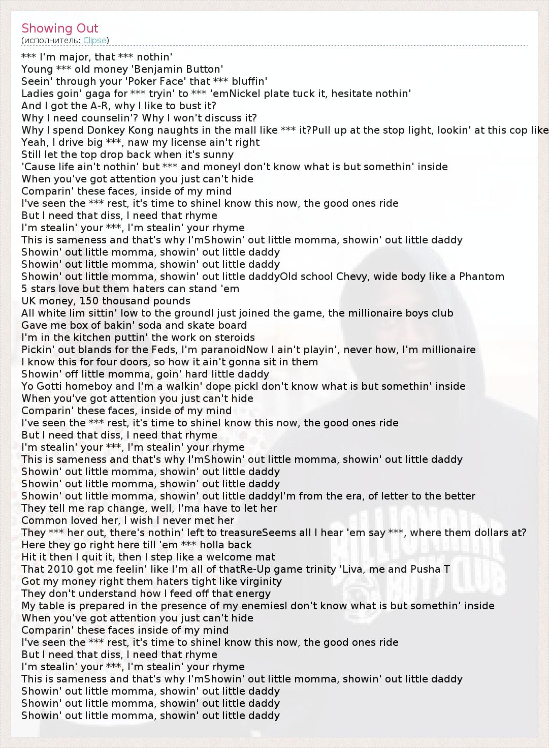 They *** her out, there's nothin' left to treasureSeems all I hear 'em say ***, where them dollars at?