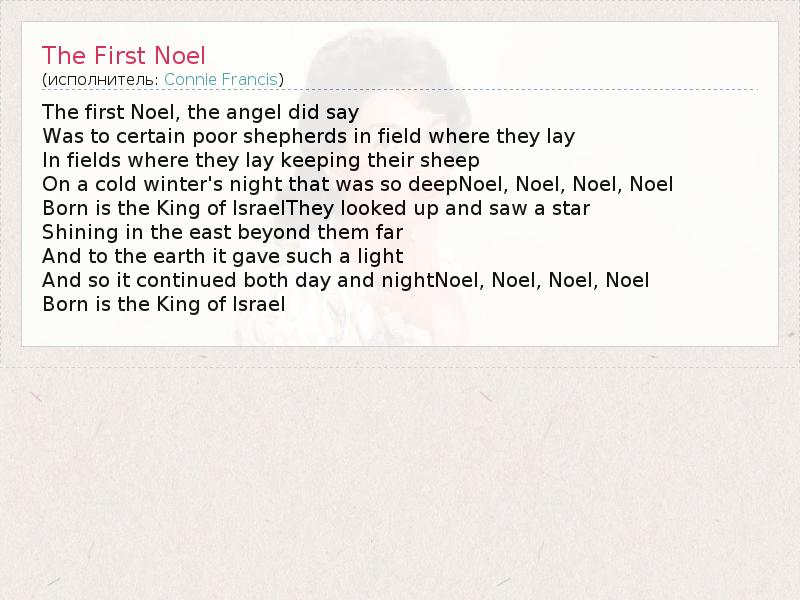 The first Noel, the angel did say Was to certain poor shepherds in field where they lay In fields where they lay keeping their sheep On a cold winter's night that was so deepNoel, Noel, Noel, Noel Born is the King of IsraelThey looked up and saw a star Shining in the east beyond them far And to the earth it gave such a light And so it continued both day and nightNoel, Noel, Noel, Noel Born is the King of Israel