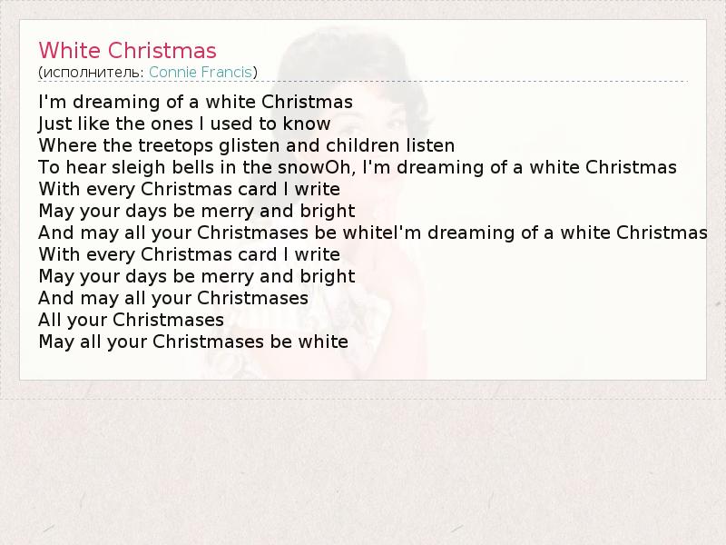 I'm dreaming of a white Christmas Just like the ones I used to know Where the treetops glisten and children listen To hear sleigh bells in the snowOh, I'm dreaming of a white Christmas With every Christmas card I write May your days be merry and bright And may all your Christmases be whiteI'm dreaming of a white Christmas With every Christmas card I write May your days be merry and bright And may all your Christmases All your Christmases May all your Christmases be white