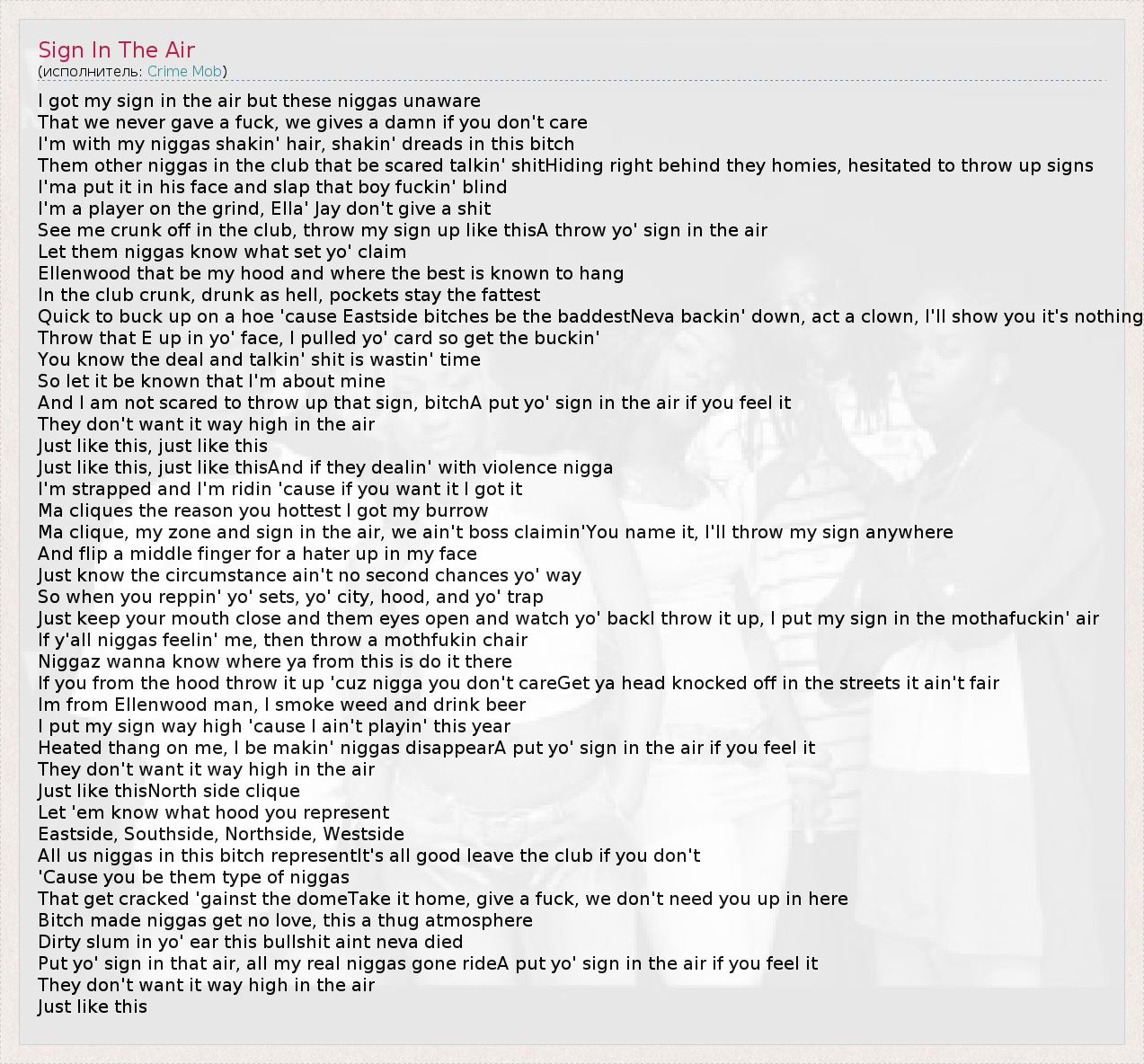 I got my sign in the air but these niggas unaware That we never gave a fuck, we gives a damn if you don't care I'm with my niggas shakin' hair, shakin' dreads in this bitch Them other niggas in the club that be scared talkin' shitHiding right behind they homies, hesitated to throw up signs I'ma put it in his face and slap that boy fuckin' blind I'm a player on the grind, Ella' Jay don't give a shit See me crunk off in the club, throw my sign up like thisA throw yo' sign in the air Let them niggas know what set yo' claim Ellenwood that be my hood and where the best is known to hang In the club crunk, drunk as hell, pockets stay the fattest Quick to buck up on a hoe 'cause Eastside bitches be the baddestNeva backin' down, act a clown, I'll show you it's nothing Throw that E up in yo' face, I pulled yo' card so get the buckin' You know the deal and talkin' shit is wastin' time So let it be known that I'm about mine And I am not scared to throw up that sign, bitchA put yo' sign in the air if you feel it They don't want it way high in the air Just like this, just like this Just like this, just like thisAnd if they dealin' with violence nigga I'm strapped and I'm ridin 'cause if you want it I got it Ma cliques the reason you hottest I got my burrow Ma clique, my zone and sign in the air, we ain't boss claimin'You name it, I'll throw my sign anywhere And flip a middle finger for a hater up in my face Just know the circumstance ain't no second chances yo' way So when you reppin' yo' sets, yo' city, hood, and yo' trap Just keep your mouth close and them eyes open and watch yo' backI throw it up, I put my sign in the mothafuckin' air If y'all niggas feelin' me, then throw a mothfukin chair Niggaz wanna know where ya from this is do it there If you from the hood throw it up 'cuz nigga you don't careGet ya head knocked off in the streets it ain't fair Im from Ellenwood man, I smoke weed and drink beer I put my sign way high 'cause I ain't playin' this year Heated thang on me, I be makin' niggas disappearA put yo' sign in the air if you feel it They don't want it way high in the air Just like thisNorth side clique Let 'em know what hood you represent Eastside, Southside, Northside, Westside All us niggas in this bitch representIt's all good leave the club if you don't 'Cause you be them type of niggas That get cracked 'gainst the domeTake it home, give a fuck, we don't need you up in here Bitch made niggas get no love, this a thug atmosphere Dirty slum in yo' ear this bullshit aint neva died Put yo' sign in that air, all my real niggas gone rideA put yo' sign in the air if you feel it They don't want it way high in the air Just like this