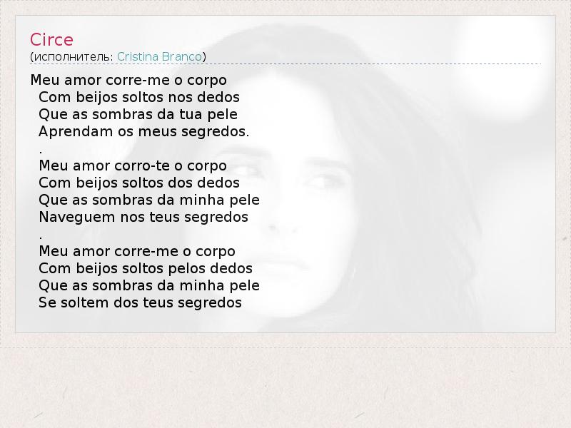 Это интересно:Кристина Бранко – непревзойденная португальская исполнительница песен фа́ду (порт. fado от лат. fatum – судьба), певица с мировым именем. Печальные песни о любви не нуждаются в переводе, а глубокий проникновенный голос певицы, ее сдержанно-сосредоточенная манера зачаровывают публику. Ее исполнение фаду переносит слушателей в мир чистой красоты, удивительного голоса, вокальный тембр которого... продолжение
