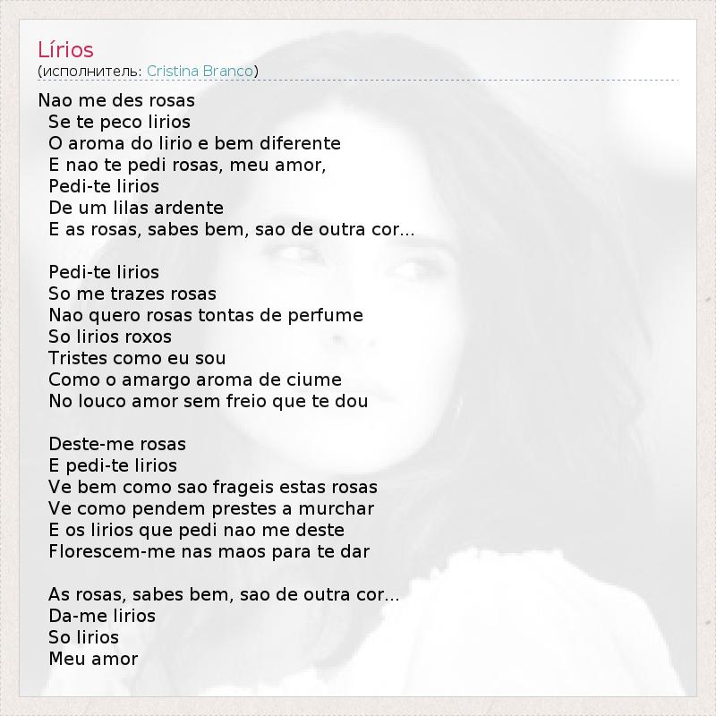 Это интересно:Кристина Бранко – непревзойденная португальская исполнительница песен фа́ду (порт. fado от лат. fatum – судьба), певица с мировым именем. Печальные песни о любви не нуждаются в переводе, а глубокий проникновенный голос певицы, ее сдержанно-сосредоточенная манера зачаровывают публику. Ее исполнение фаду переносит слушателей в мир чистой красоты, удивительного голоса, вокальный тембр которого... продолжение