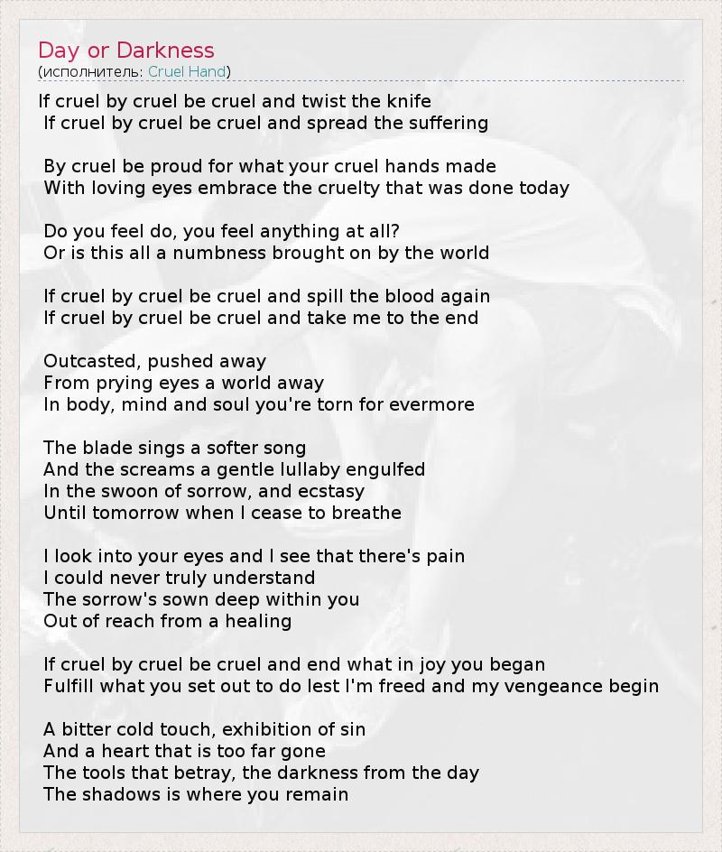 If cruel by cruel be cruel and twist the knife If cruel by cruel be cruel and spread the suffering By cruel be proud for what your cruel hands made With loving eyes embrace the cruelty that was done today Do you feel do, you feel anything at all? Or is this all a numbness brought on by the world If cruel by cruel be cruel and spill the blood again If cruel by cruel be cruel and take me to the end Outcasted, pushed away From prying eyes a world away In body, mind and soul you're torn for evermore The blade sings a softer song And the screams a gentle lullaby engulfed In the swoon of sorrow, and ecstasy Until tomorrow when I cease to breathe I look into your eyes and I see that there's pain I could never truly understand The sorrow's sown deep within you Out of reach from a healing If cruel by cruel be cruel and end what in joy you began Fulfill what you set out to do lest I'm freed and my vengeance begin A bitter cold touch, exhibition of sin And a heart that is too far gone The tools that betray, the darkness from the day The shadows is where you remain