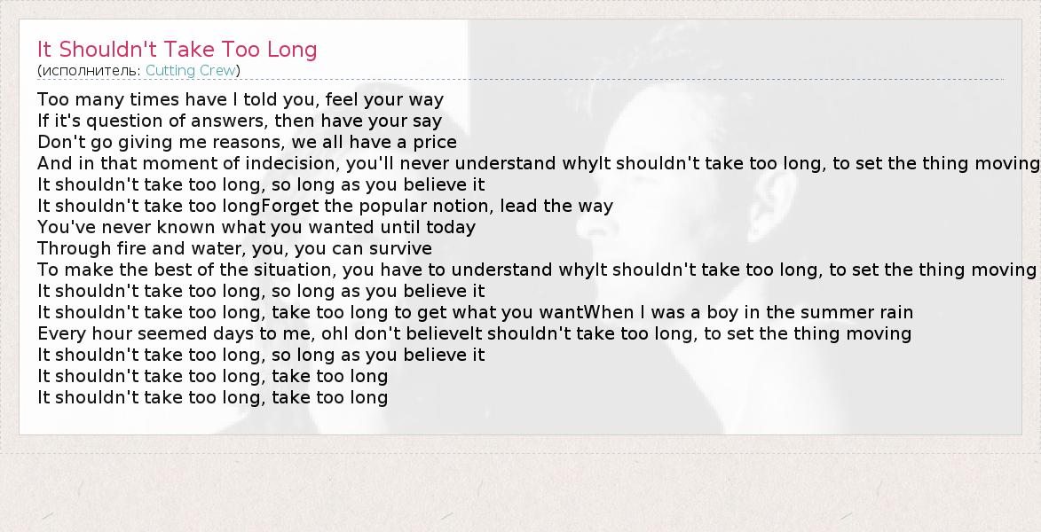 А как ты думаешь, о чем песня "It Shouldn't Take Too Long" ?