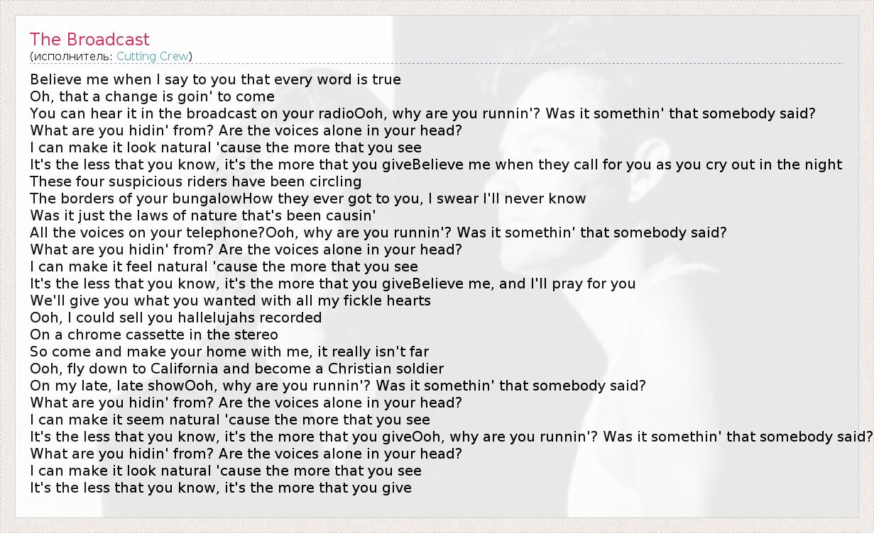 Believe me when I say to you that every word is true Oh, that a change is goin' to come You can hear it in the broadcast on your radioOoh, why are you runnin'? Was it somethin' that somebody said? What are you hidin' from? Are the voices alone in your head? I can make it look natural 'cause the more that you see It's the less that you know, it's the more that you giveBelieve me when they call for you as you cry out in the night These four suspicious riders have been circling The borders of your bungalowHow they ever got to you, I swear I'll never know Was it just the laws of nature that's been causin' All the voices on your telephone?Ooh, why are you runnin'? Was it somethin' that somebody said? What are you hidin' from? Are the voices alone in your head? I can make it feel natural 'cause the more that you see It's the less that you know, it's the more that you giveBelieve me, and I'll pray for you We'll give you what you wanted with all my fickle hearts Ooh, I could sell you hallelujahs recorded On a chrome cassette in the stereo So come and make your home with me, it really isn't far Ooh, fly down to California and become a Christian soldier On my late, late showOoh, why are you runnin'? Was it somethin' that somebody said? What are you hidin' from? Are the voices alone in your head? I can make it seem natural 'cause the more that you see It's the less that you know, it's the more that you giveOoh, why are you runnin'? Was it somethin' that somebody said? What are you hidin' from? Are the voices alone in your head? I can make it look natural 'cause the more that you see It's the less that you know, it's the more that you give
